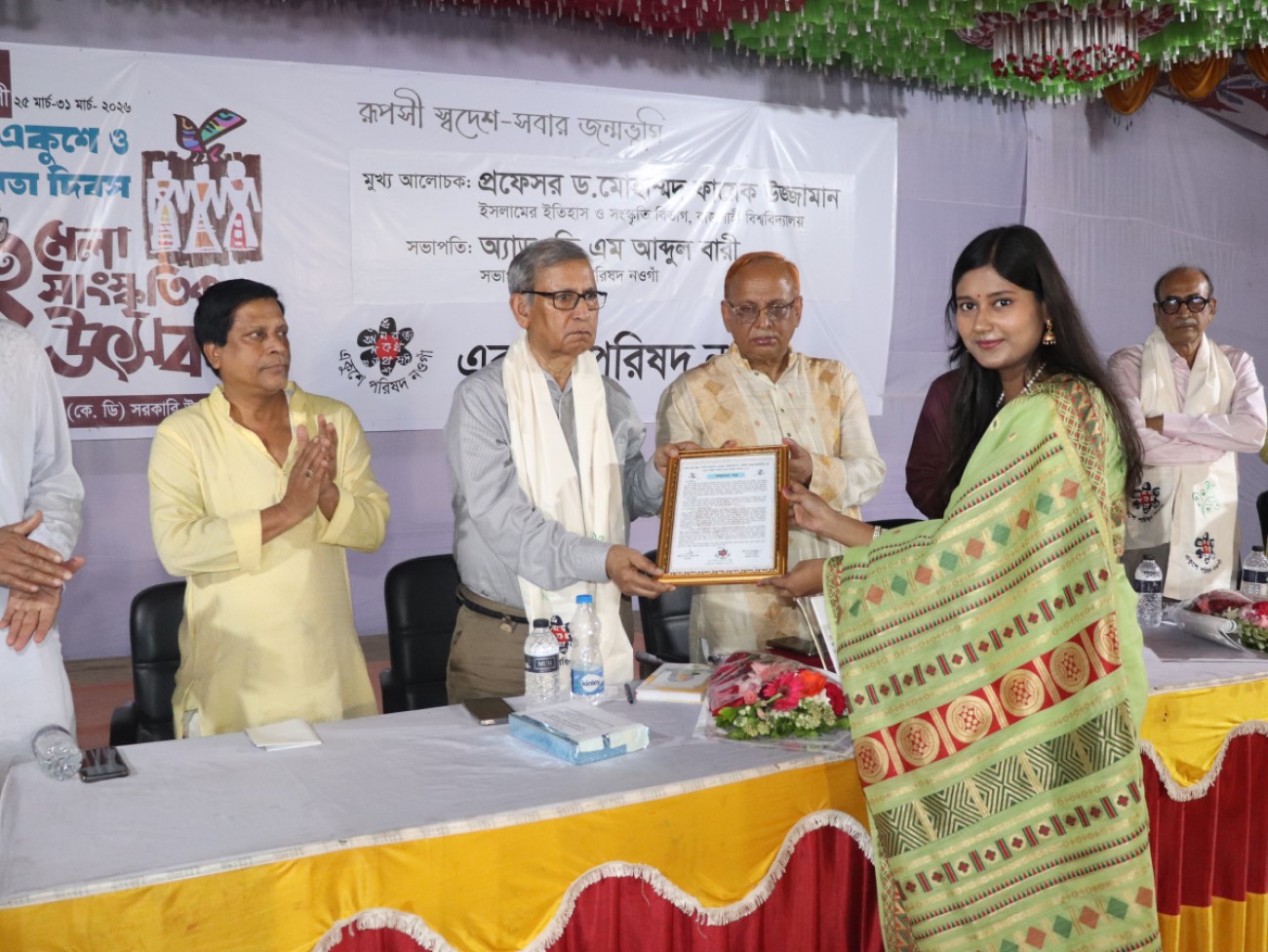 During the festival, Professor Dr. Golam Abu Zakaria, a prominent son of Naogaon district, a pioneer of medical physics in Bangladesh, an internationally renowned educationist and the Honorable Chairman of Alo Bhuvan Trust, was felicitated as a distinguished personality in recognition of his outstanding contribution to education and science. In his speech, Professor Zakaria praised the initiatives and efforts of the Naogaon Ekushey Parishad and shared the memorable experiences of his student life at K.D. School.